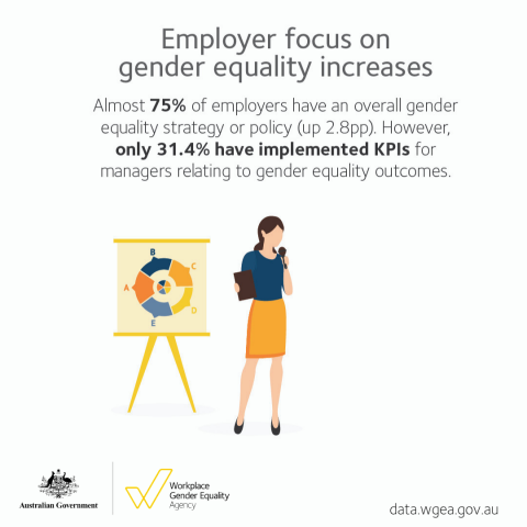 The WGEA data records a steady increase in the number of women in management roles and strong growth in employer action in areas such as overall gender equality policies and strategies, pay equity and flexible work.