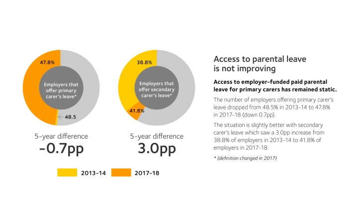 Access to parental leave is not improving. In 2014, 48.5% of employers offered primary carers leave. The number has dropped to 47.9% in 2018.
