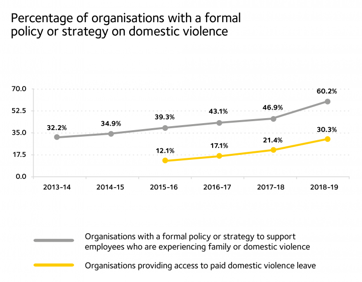 This sixth year of data collection has revealed a sharp increase in the number of Australian organisations supporting employees who are experiencing family or domestic violence.