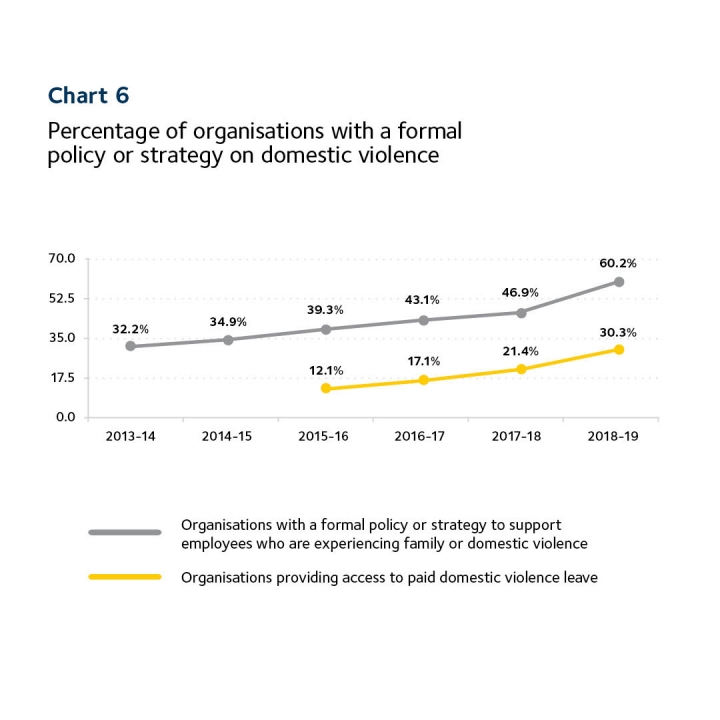 In the last 12 months, there has been a sharp increase in the number of employers that have put a policy or strategy in place around domestic violence. It went up by 13.3 percentage points in one year. We now have over 60% of all organisations with a policy or strategy in place to support domestic violence. Nearly a third of our organisations now offer paid leave for those affected by domestic violence. Employers recognise that they do have a very important role to play here and implement it.