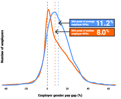 50% of private sector employers have an average total remuneration gender pay gap above 11.2% and 50% of employers have a gender pay gap lower than this point. This is known as the mid-point of employer gender pay gaps and it has reduced by 0.9pp in the past 12 months.