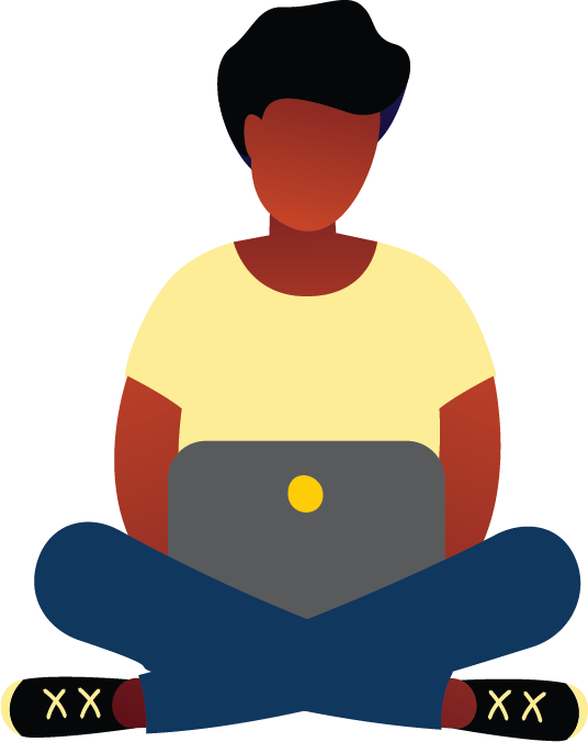 Image is decorative and depicts a young man sitting cross-legged with a laptop