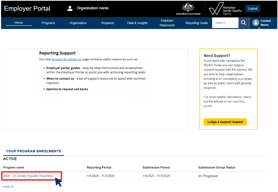 Step 1: Log into the Employer Portal and select your Gender Equality Reporting program.