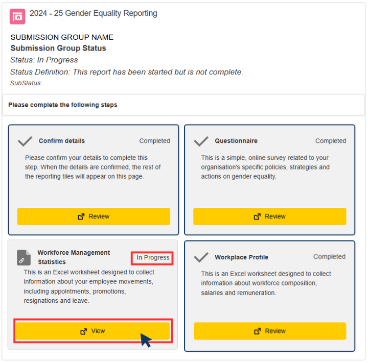 Step 2: Your submission group status will remain 'In Progress' if you have outstanding data anomalies detected within your submission. Select 'View' in the relevant section that contains 'In Progress'.