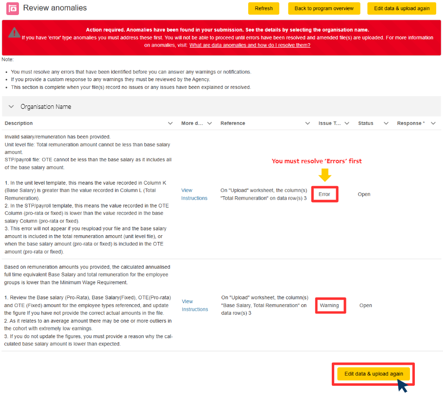 For information about data anomalies and guidance on resolving common anomalies, refer to Resolving data anomalies | WGEA.