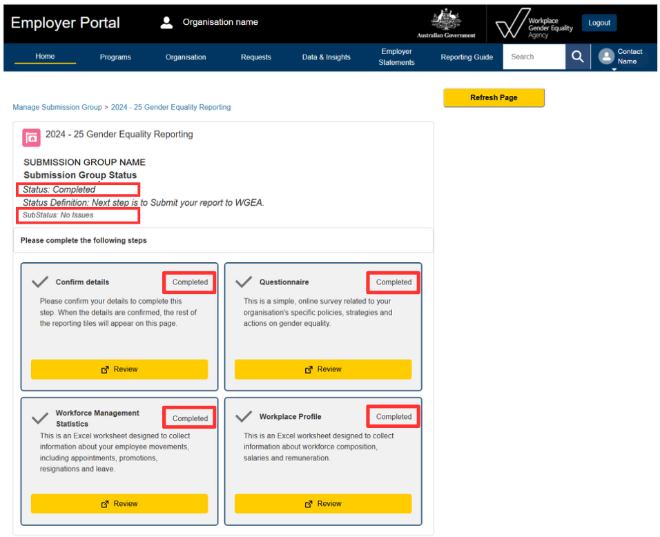 Your Gender Equality Report is ready to lodge once your Submission Group Status displays 'Completed' with a Sub Status of 'No Issues'.
