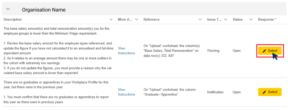 Click the 'Select' button next to a data 'Warning' or 'Notification'.
