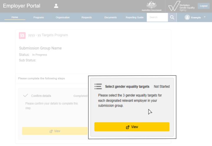 On the Targets Program page, select ‘View’ on the Select gender equality targets tile.